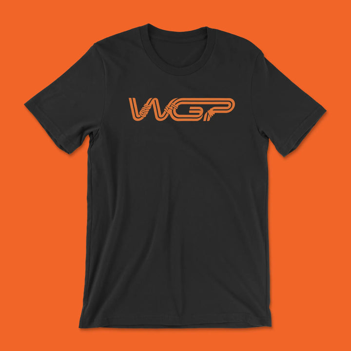 Black Organic Cotton T-shirt with Orange WGP logo with PWCo woven label detail.